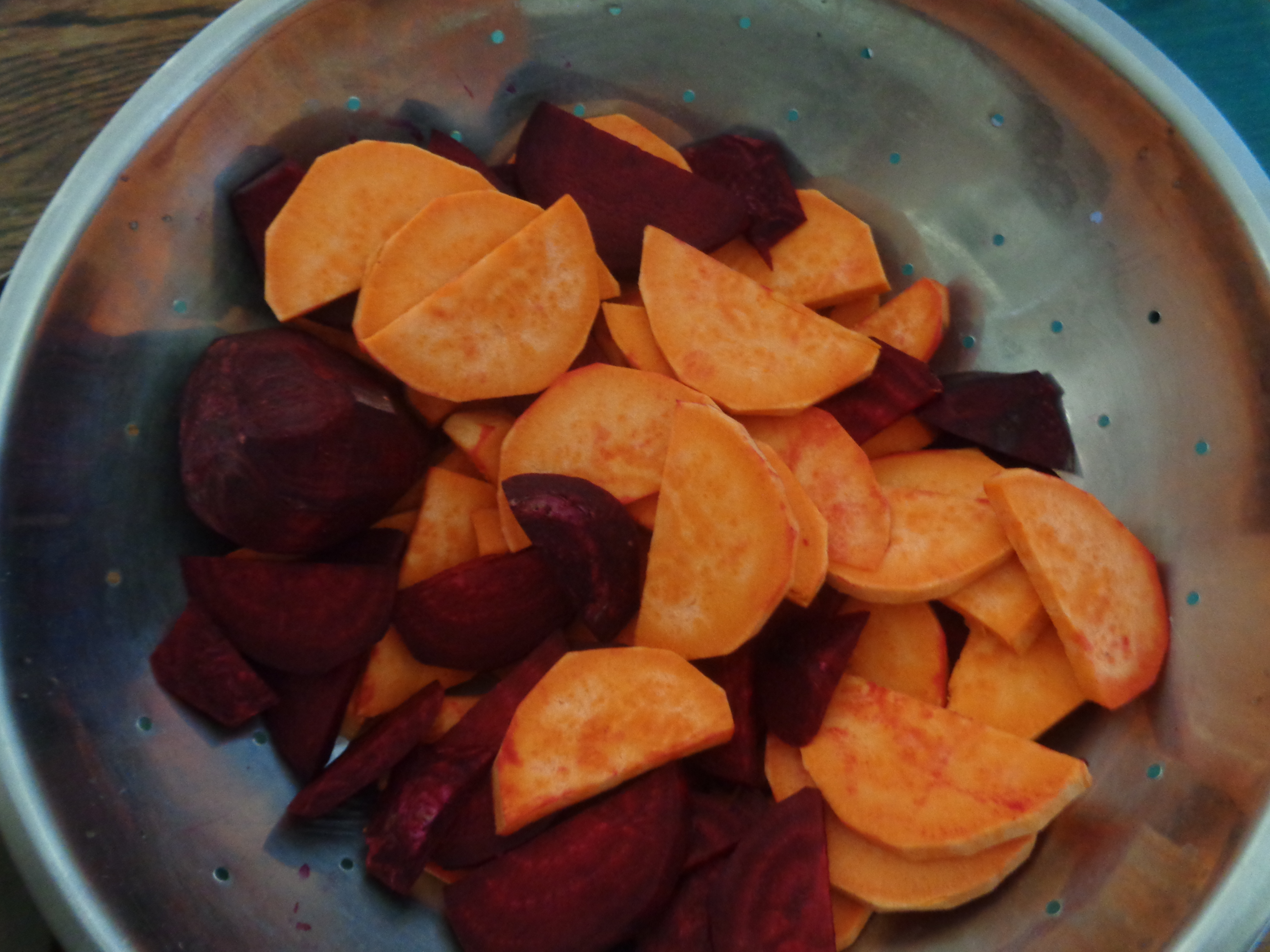 Cut slices of beets and yams. Cook in butter and olive oil. Simmer until soft. I didn’t use any seasoning. Cool and serve.